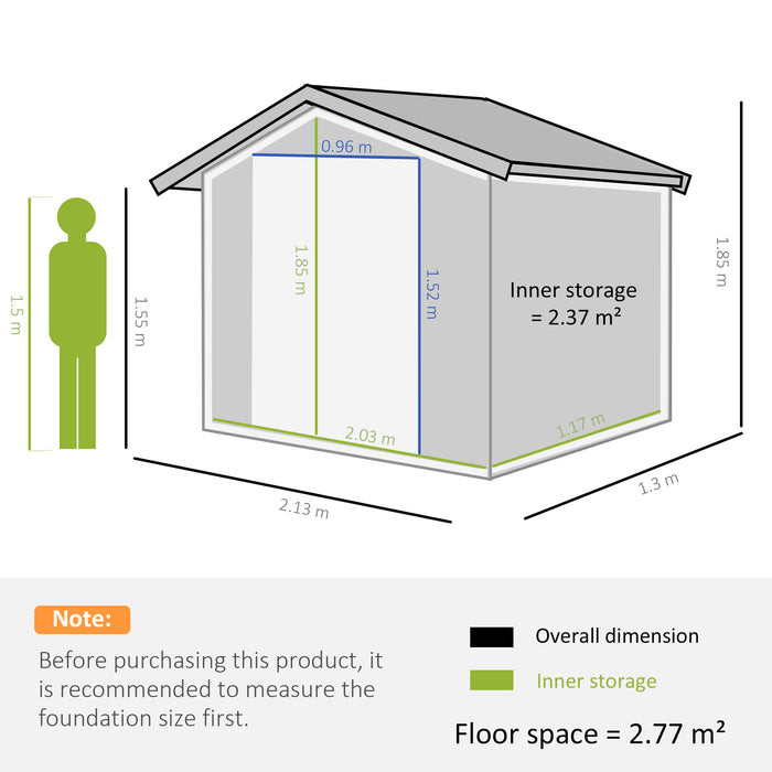 With external dimensions of 185H x 213L x 130Wcm and interior spanning 185H x 203L x 117Wcm, the shed provides substantial space. The entrance measures at a convenient 152H x 96Lcm. Set-up is a two-person job – don't forget to put on gloves for safety. Rest assured, a sturdy floor foundation is also included to keep your shed level and secure on any terrain.