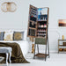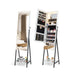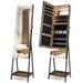 This floor standing jewelry armoire will be the perfect solution for all your jewelry storage needs! With its unique segmented mirror design, this mirrored jewelry cabinet is a beautiful addition to any room. Additionally, the jewelry cabinet comes with a small mirror inside, providing the perfect spot for your daily makeup routine. Designed with a variety of storage compartments, the lockable jewelry armoire can keep your rings, earrings, necklaces, cosmetics and other items well organized and secure. Moreover, with 3 different color lights, you can create the perfect ambiance for showcasing your jewelry by easily pressing the light switch. Unique Mirror Split Design: The cabinet door with frameless mirror plus the bottom drawer with front mirror panel provides you with a head-to-toe view as well as clear reflection. Plus, the special mirror split design can add a sense of fashion to your home. Large Capacity and Easy Organization: This jewelry armoire features multiple storage areas to organize all your belongings, including 64 earring slots and 16 earring stud holes, 1 bracelet rod, 12 necklace hooks, 48 ring slots, 1 foldable shelf, 3 acrylic cosmetics boxes, 3 storage shelves, 1 drawer and bottom storage shelf. Built-in Mirror with 3-Color Lights: The jewelry cabinet comes with an internal makeup mirror and 3-color bright LED strip (warm yellow, blue, white), making it easier for you to choose jewelry and try on. Besides, the LED lighting is powered by 3 x AA batteries (not included). Upgraded Stability and Security: The sturdy metal frame and back reinforced bar enhance the overall stability of this standing jewelry organizer armoire. Moreover, the jewelry cabinet is designed with a lockable door with 2 keys to keep your precious jewelry safe. Thoughtful Details and Easy Assembly: The soft velvet lining can protect your jewelry from scratches. And you can flip the shelf down to place cosmetics, brushes, etc. during your makeup. What's more, by following detailed instructions, the jewelry cabinet can be put together with ease.