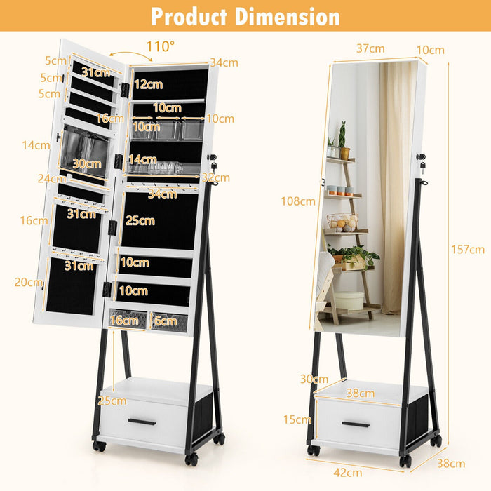 Introducing the ultimate solution for jewelry and accessory organization, our elegant freestanding jewelry mirror cabinet effortlessly combines functionality with style. Not only is this piece a chic addition to any room, but it also offers ample storage space crafted to accommodate a variety of jewelry sizes and styles. Step in front of the full-length mirror with confidence as you dress up and apply your makeup, reveling in convenience and luxury.