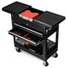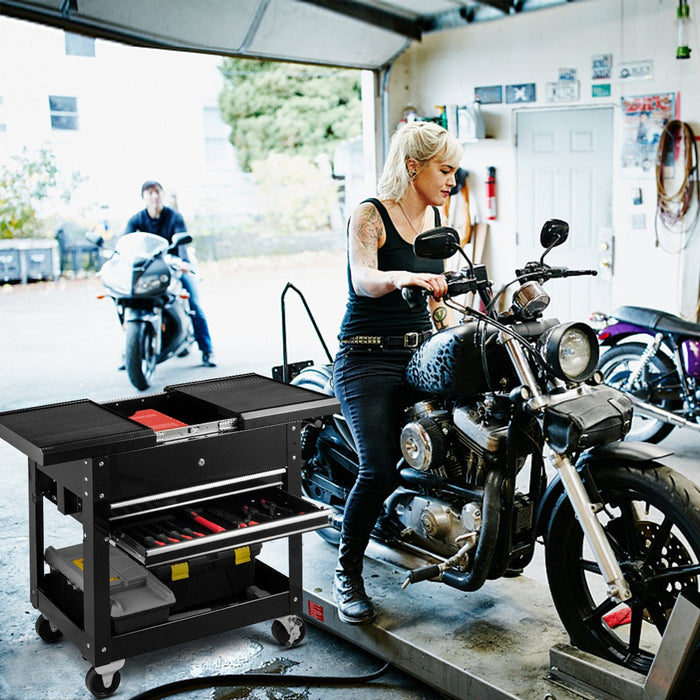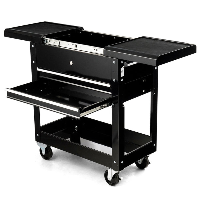 Are you still looking for a tool storage assistant? This rolling tool cart offers you ideal tool storage options, including a spacious top, a hidden cabinet, 2 sliding drawers and a large bottom tray. All parts are lockable to keep your valuable tools intact. Furthermore, the heavy-duty metal frame with anti-rust treatment enables the cart to suit any working environment. Thanks to 4 flexible casters (2 lockable) and a side handle, this mechanic tool organizer ensures outstanding mobility. The tool box with wheels is perfect for workplaces, such as auto repair, garage, workshop and so on. Bullet Points Extra Large Capacity: This rolling tool cart offers diverse storage options, including a spacious top with hidden storage area, 2 sliding drawers and a large bottom tray. Thus, you can classify and organize all your tools for easy access when working. High-strength Structure: This tool cart is made of heavy-duty metal with black finish, which is resistant to rust, wear and scratches for maximum durability. The solid construction endows the tool organizer a stronger load capacity up to 220 kg. Easy to Move: Fitted with 2 smooth casters and 2 lockable casters, this tool cart can be freely moved around while keeping stable when stopped. What's more, the metal handle provides a comfortable grip for effortless pushing. Thoughtful Design: To prevent valuable tools from being stolen, the tool box is equipped with a locking system for peace of mind. Smooth sliding rails make each drawer easy to push in and pull out. Plus, rubber liners protect your tools from scratches. Wide Applications: This tool box on wheels is ideal for storing and transporting tools. It can be used widely in the garage, workshop, warehouse, auto repair and more. Detailed instructions are supplied to help with quick assembly!