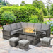 The set includes three double corner sofas, three footstools, and one gas fire pit table. In addition to the furniture, you'll receive six seat cushions, seven back cushions, three footstool cushions, and a comprehensive manual to guide you through the assembly process, ensuring that setting up your new outdoor retreat is as relaxing as enjoying it.