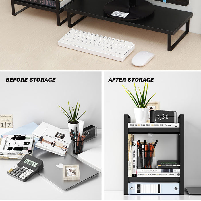 Our desk riser is designed to conserve space without compromising on its multiple functionalities. The storage rack is perfect for managing your desk accessories efficiently. You can also conveniently slide your keyboard underneath when it's not in use.