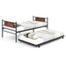 This sleek and stylish sofa bed features a heavy-duty metal frame with rock-solid bolted connections that can support up to 160 kg. No need for a box spring! Effortlessly roll out the trundle bed on its smooth wheels whenever you need extra sleep space, and tuck it away under the twin bed when not in use. It's not just a sofa - it's a single-size daybed and guest bed too! And with its retro wood grain headboard and footboard design, it adds a touch of nostalgia to any room. Upgrade your home with our metal trundle bed today! If you are looking for such a product, do not hesitate to buy it! Pull-out Design to Save Space: Maximize your living space with this innovative 2-in-1 sofa bed. Its pull-out design allows you to nest the beds together, creating more room for everyday use, or separate them as guest beds when needed. Heavy-duty Metal Frame: Crafted with durable rustproof metal pipes and strong bolt connections, this daybed is built to last. Each bed can support up to 160 kg, and with sturdy metal slats, you won't need a box spring. Effortless Convenience: Easily roll out or stabilize the trundle bed with 4 universal wheels, 2 brakes. Plus, rest easy knowing that the daybed is equipped with protective foot pads to prevent any floor damage. Retro Industrial Appeal: With a beautiful rustic wood grain headboard, the double platform bed blends seamlessly with any decoration style in your living room, adding a touch of vintage charm to your space. Quick and Easy Assembly: With detailed instructions and labeled accessories, you'll have this metal daybed set up in no time. It's the perfect addition to any home or apartment, ideal for bedrooms, living rooms, and guest rooms alike.