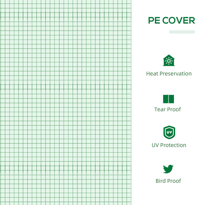 Enveloped in an appealing green hue, the structural elements consist of steadfast steel and shielding PE material. With stability against winds up to a level 4 (under 28 km/h), your portable garden promises a sanctuary for your plants. An adequate window measurement of 45W x 28H cm grants substantial ventilation, while the PE cover, weighing 140 g/m², ensures optimal plant health.