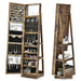 The armoire's backside reveals a tiered shelving system, offering extra storage space to house your perfumes, cosmetics, and various sundries. With a plethora of hooks and racks, every necklace, bracelet, and chain remains meticulous and free of entanglements.