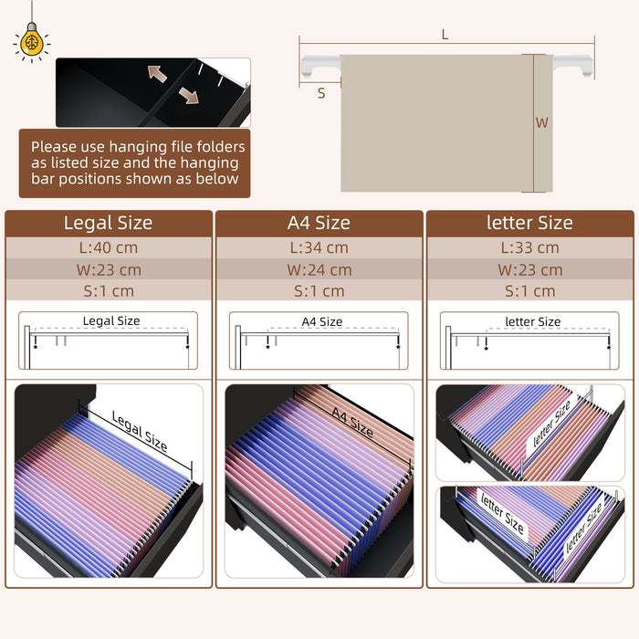 The Vinsetto Filing Cabinet boasts a generous storage capacity with two compact upper drawers and one expansive lower drawer, providing ample space for various document sizes and office supplies. The bottom drawer features an adjustable hanging bar to accommodate letter, A4, and legal-sized files, ensuring your paperwork is always in order.
