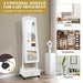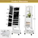 Designed with multiple compartments and separate hooks, this jewelry cabinet can not only organize all your jewelry in one place, but also ensure quick access to what you need. Plus, the bottom shelf and drawer provide extra storage space for other items. The full-length HD mirror gives you a wide and clear view to check your outfit. In addition, there are 3 horizontal holes on each side of the stand, allowing you to adjust the tilt angle of the mirrored cabinet (98°, 102°, 106°) to get the best view. The 6 LED lights will auto on with the door open and make your jewelry sparkle. Moreover, the lockable design ensures the safety of your jewelry and the smooth rolling wheels with brakes ensure easy movement. Large Storage Capacity: Featuring 100 earring slots and 45 holes, 1 bracelet rod, 36 necklace and bracelet hooks, 72 ring slots, 1 storage pocket, 4 storage shelves and 2 small drawers, this jewelry cabinet can make all your jewelry and cosmetics neatly organized without getting tangled. Plus, there is a shelf and big drawer at the bottom to hold your shoes, books, bags and more. Full-length Mirror and 6 LED Lights: This mobile jewelry armoire is equipped with a full-length mirror, which offers a head-to-toe view for you to check your everyday outfit. In addition, the interior 6 auto-on LED lights make it convenient to select jewelry you want and check your makeup. The lights are powered by 3 AAA x 1.5V batteries (not included). 3 Adjustable Angles and 4 Wheels: This freestanding jewelry organizer cabinet is adjustable in 3 angles: 98°/102°/106°, which allows you to choose the most suitable tilt angle to get a better view. Moreover, with 4 lockable universal wheels, you can move this jewelry cabinet from room to room and lock it in place easily. Lockable Design and Durable Material: To keep every piece of your jewelry safe, this mirror jewelry cabinet is equipped with a lock and 2 keys. And the soft velvet lining helps to prevent the jewelry from scratching or wearing. Made of high quality MDF and premium metal hinges, this jewelry cabinet ensures great stability and a long service life. Elegant Appearance and Easy Assembly: Featuring elegant and exquisite patterns, this 2 in 1 jewelry cabinet with full-length mirror will be an eye-catching and functional addition to your bedroom, dressing room, living room, etc. Since the cabinet body is pre-assembled, you only need to assemble the base and install the wheels.
