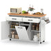 It offers a broad countertop, spice rack and 2 drawers, catering to your various culinary need. Moreover, each side cabinet is equipped with a 3-position shelf, ensuring it comfortably fits items of varying sizes. The integrated towel rack doubles as a handy push handle, enhancing the island table’s practicality. For those who value neatness, the kitchen island cleverly conceals waste with a designated storage that fits 4-gallon trash bags, complete with 2 hooks for secure hanging. The island cart features smooth mobility with its 6 universal wheels, making repositioning a breeze, and 2 can be locked to provide stability as you work. Bullet Point: Large Storage Capacity: Enhance your kitchen with the multifunctional island featuring a spacious countertop perfect for meal prep. Besides, it is accompanied by a convenient spice rack, 2 pull-out drawers, and 2 single-door cabinets, offering ample storage options. Mobile Convenience: The island cart is outfitted with 6 universal wheels, and it can effortlessly move around to simplify your kitchen layout. Additionally, 2 wheels are lockable for stability, giving you peace of mind. Clever Waste Disposal: Integrated with hidden trash storage, the middle cabinet is perfect for 4 gal trash bags, blending functionality with neatness in your kitchen environment. Furthermore, the 2 built-in hooks securely hang the refuse bags. Adjustable Storage Solutions: The single-door cabinets come with 2 adjustable inner shelves, and each one is available in 3 levels(3.2cm spacing between settings). Thus, the island table easily adapts your storage needs, ensuring things have their places. Well-made Construction: Crafted from premium materials, the kitchen island promises long-lasting use. Moreover, it includes a towel rack that doubles as a push handle, smooth slide rails, handy handles and quality metal hinges to emphasize convenience blended with endurance.