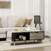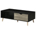 Our coffee table offers not just a surface for your mugs and magazines but also boasts convenient storage solutions. With a sliding drawer and an ample shelf space on each side, your essentials are always within arm's reach. The sleek, modern design is accentuated with a chic black finish and contrasting, wood-effect drawers that add a warm touch to its contemporary, boxy silhouette.