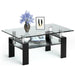 This coffee table is a perfect complement to any room. The 2-tier design provides a lot of storage space for books, magazines, remote controls, tea sets or other decorations. Made of tempered glass, this coffee table features excellent durability and heat resistance. Constituted with iron and stainless steel, the coffee table is sturdy and durable. The iron legs are treated with powder coating, which not only enhances the beauty but also effectively prevents rust. You can easily handle stains with a smooth glass tabletop. The detailed instructions solve your troubles of installation difficulties. This modern glass table is suitable for apartments or offices with various decoration styles. Don't hesitate to order one! Its smooth surface makes your cleaning easier Double-tier design brings larger storage space With stainless steel pipe connection, good stability The sturdy iron table legs will not break during use Tools come with the product to facilitate assembly Simple and modern appearance suitable for any style of the room Tempered glass for better heat resistance and impact resistance