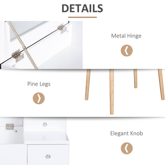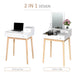 The vanity's transformative design brings versatility to your home. Whether applying cosmetics, styling your hair, or focusing on work, this table adapts to your needs. The superior storage capacity and the subtle combination of white and natural wood finishes make this compact size table a fashionable and practical addition to any home.