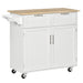 The thoughtful design of this trolley includes a large enclosed cabinet at the bottom, two generously sized drawers, and a convenient rack on the side—perfect for hanging tea towels or other essentials within reach. The overall dimensions of 91H x 104W x 46Dcm makes this cart a spacious yet unobtrusive addition to any kitchen.