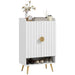 A testament to tasteful aesthetics, this cabinet features gold accented handles and delicately poised feet, complementing its beadboard paneling. The top surface is thoughtfully designed with raised edges to keep your necessities safely perched and at hand.