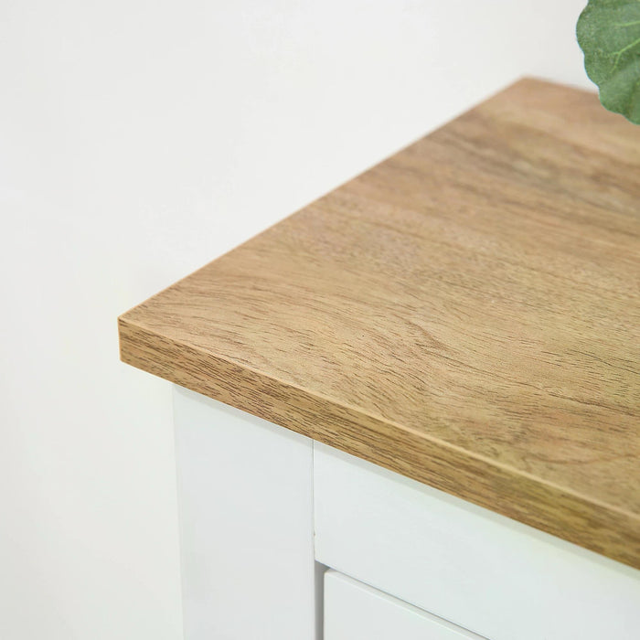 The cabinet's sleek silhouette is characterized by a minimalist white finish with a hint of wood effect, ensuring it harmonizes effortlessly with your existing home decor. The flat top surface offers additional functionality, presenting a perfect platform for your keys, decorative items, or even a chic vase.
