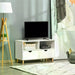 Constructed from a solid and reliable particle board material, our TV stand is built to last. It is enveloped in a melamine finish which not only offers light resistance to wear and tear but also presents a smooth exterior that's easy to clean and maintain. You can feel assured of the longevity of this piece, making it a smart addition to any home.