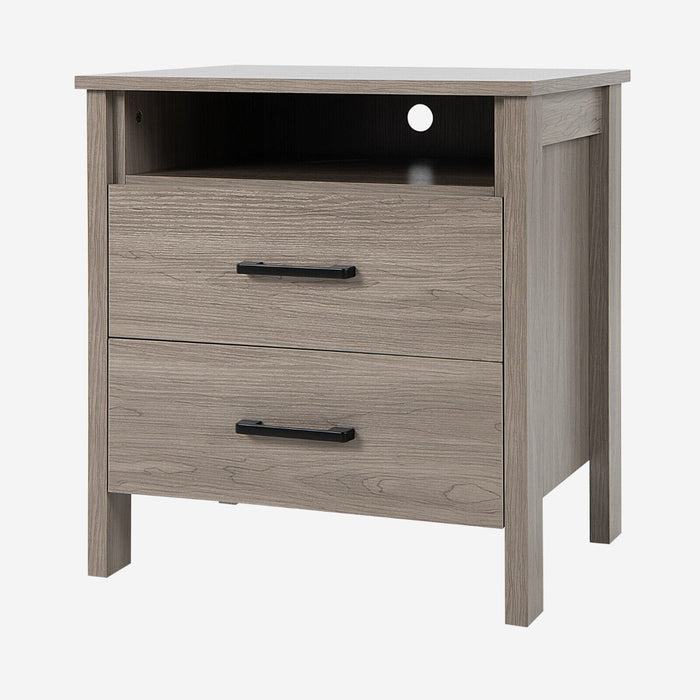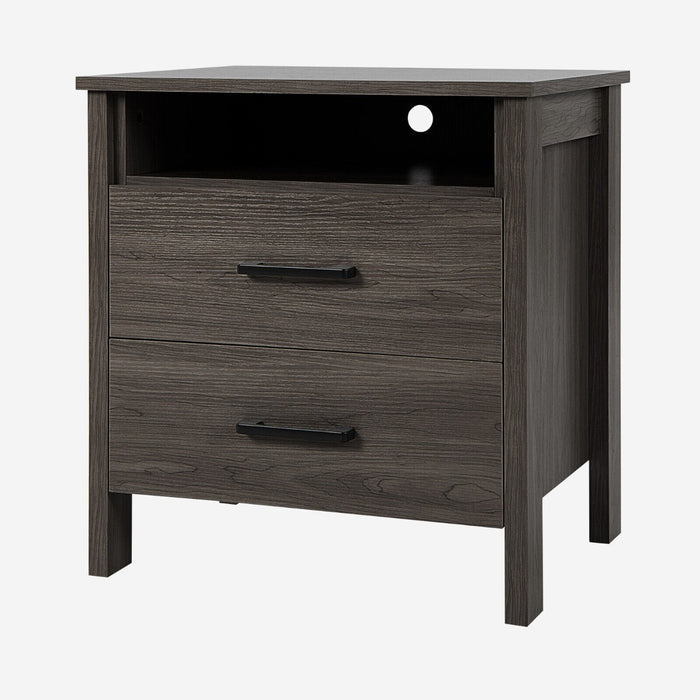 The seamless integration of form and function is evident in the carefully implemented features. Our nightstand's open compartment includes a discrete circular cut-out, serving as a tidy solution for cable management — your electronics' cords no longer need to drape messily atop your furnishings. Convenience is further enhanced by the presence of sleek handles and smooth drawer slides for effortless access to your stored items.