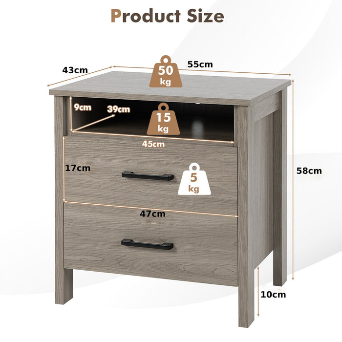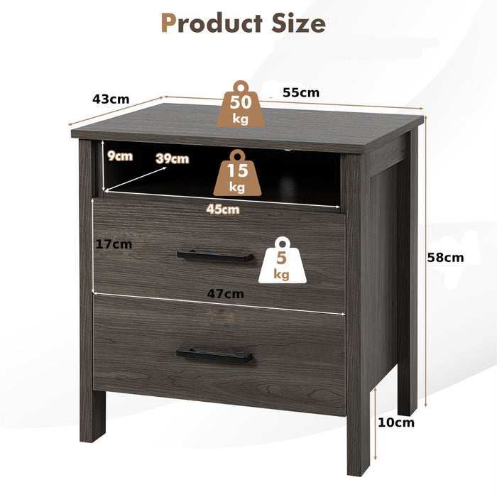 Our thoughtfully crafted nightstand features a generous surface area atop two smoothly gliding drawers and an easily accessible open compartment. The expansive tabletop offers plentiful space for your favorite lamp, beverages, or a curated selection of decorative pieces. Below, you'll find the perfect spots to tuck away books, glasses, and cherished keepsakes, ensuring your essentials are always within arm's reach while maintaining a clutter-free environment.