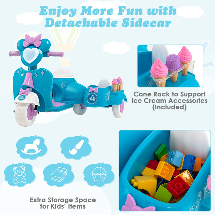 Not just a ride, but an immersive play session awaits with the delightful ice cream toys provided. Your child can delve into the realm of imagination, indulging in lively role-playing games with friends and family, with the sidecar offering the perfect space for their pretend small-scale business ventures and more.