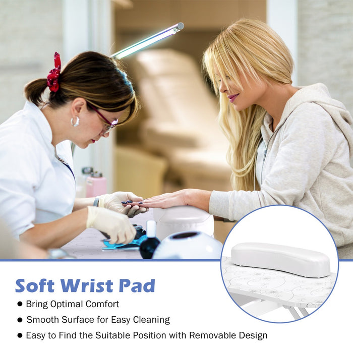 The manicure table showcases an elegant desktop with a sophisticated black and white color scheme adorned with graceful patterns. A touch of luxury is added by the plush wrist pillow designed to cradle your comfort during extensive sessions. Its smart arc design is rooted in ergonomic principles, ensuring a seamless and enjoyable experience.