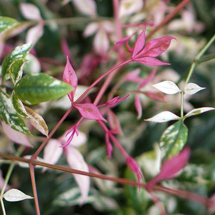 Also known as Heavenly or Sacred Bamboo, Nandina will bring a bright flash of dazzling colour to your borders or patio pots, making it invaluable in winter when there's little colour around. Not unlike a colourful version of our own native holly, Nandina has a bushy upright habit, with toothpick-straight stems making it an excellent candidate for containers - and this particular variety has amazing variegated leaves which give off a sultry pink glow. As it's evergreen, Nandina retains its foliage throughout the year and the colours change as temperatures dip, taking on deeper and more saturated hues. A true multi-season feature plant, in spring new leaves emerge flushed pink, green and cream, then in summer, small creamy-white flowers are followed by green berries, before the leaves develop more colour and the berries turn sealing-wax red - just superb! Really easy to grow - just plant it and leave it! Supplied as an established plant in a 2L pot