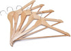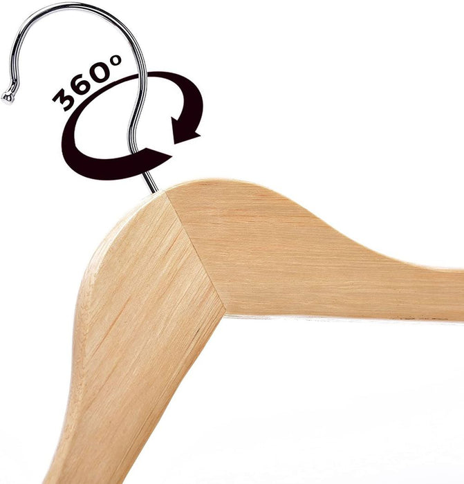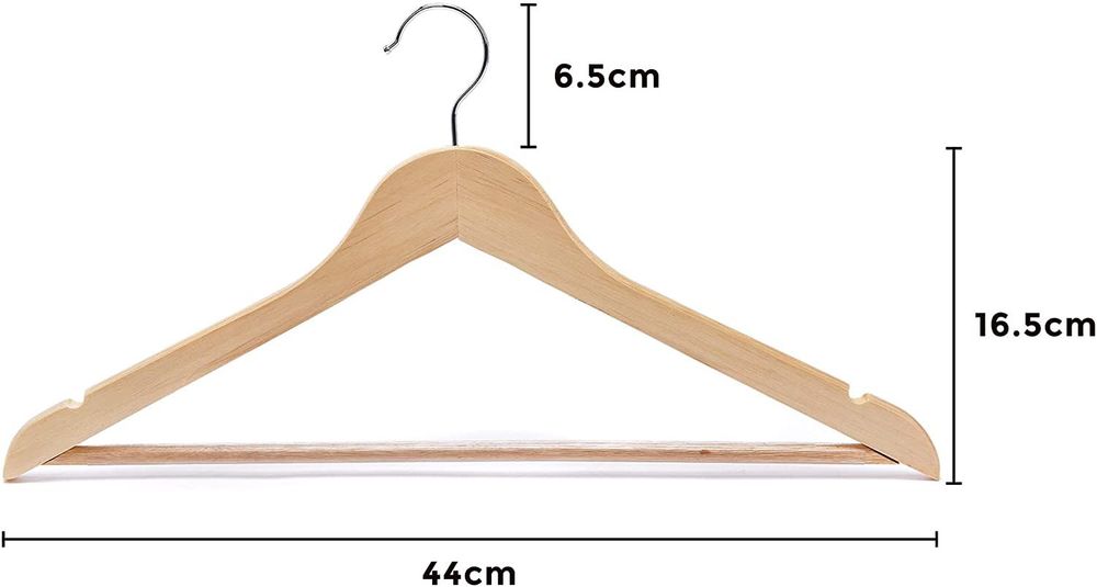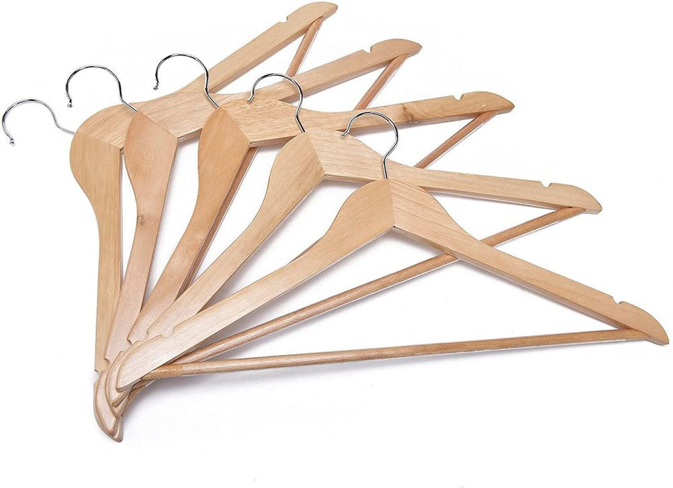 GRADE A MATERIAL WOOD: This pack of 10 well-finished wooden hangers are an excellent upgrade for your plastic and wire hangers. Their natural wood colour and varnished look will give a luxury and eco touch to your closet. Day-to-day objects that everyone uses and needs can also be sophisticated and long-lasting.