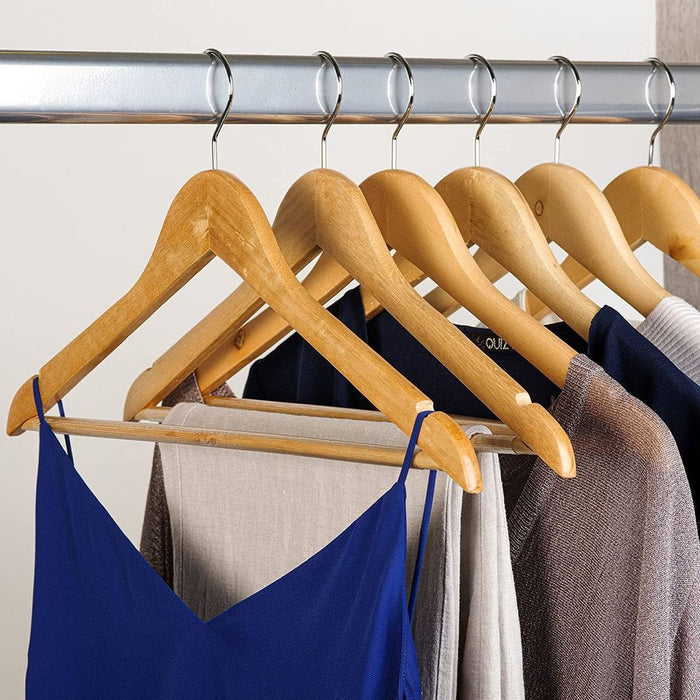 NON-SLIP TROUSER RAIL: The design of these clothes wooden hangers includes an anti-slip bar for your trousers to be held securely. Keep the inside of your wardrobe organised and attractive without unwanted wrinkles in your garments. It is the perfect item to get your suits easily combined, and your outfit of the day put together for your early mornings.