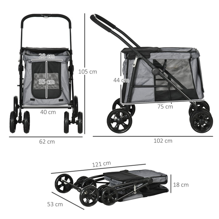 Measuring up at 105H x 102L x 62W cm, with an interior space of 44H x 75L x 40W cm, this stroller comfortably accommodates small to medium-sized dogs. It supports a maximum load of 20kg, ensuring it's a perfect match for your pet's needs.
