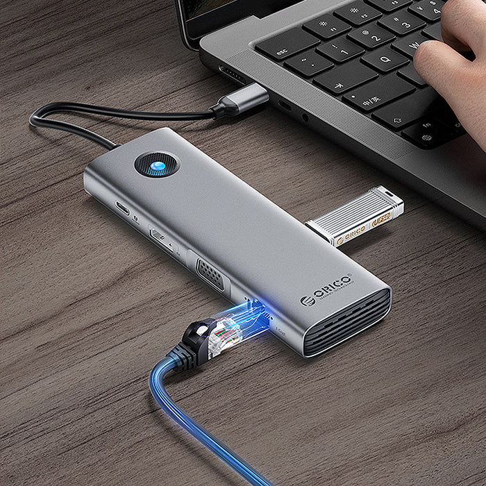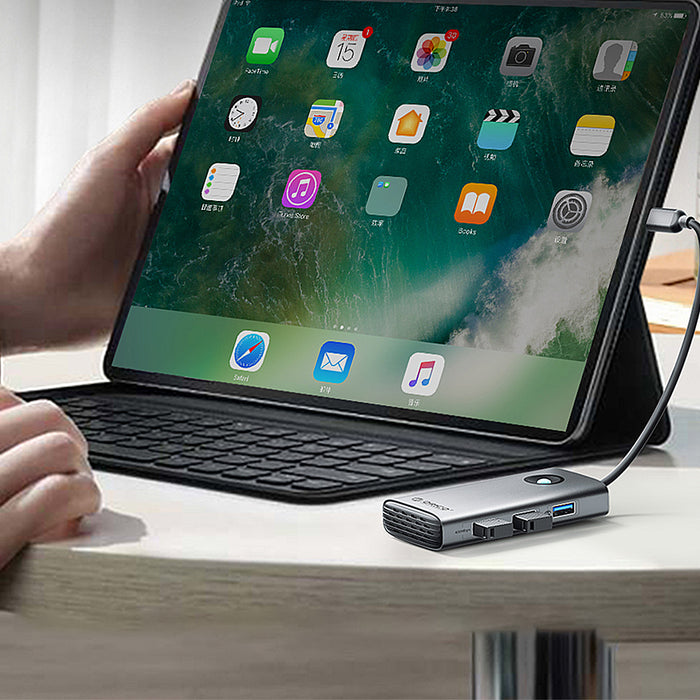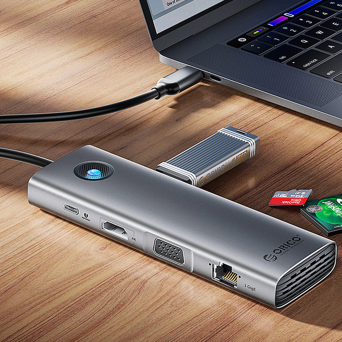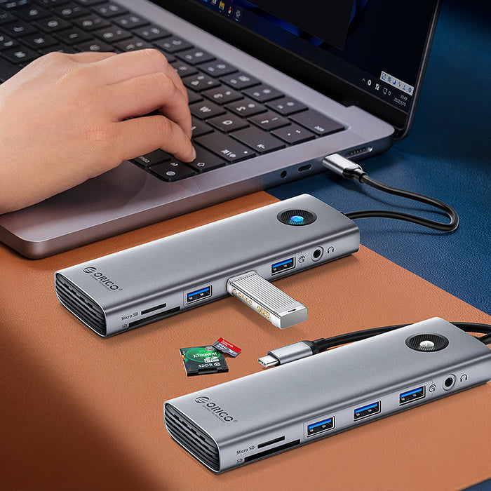 Discover unparalleled convenience and versatility with the 10-in-1 Type-C Docking Station by ORICO. This sleek grey aluminum alloy hub provides a single connection point for all your essential devices, meeting all your needs without the need for additional drivers. Enjoy ultra-fast data transfer speeds, PD100W fast charging support, 4K video output, high-speed network connectivity, Hi-Fi audio, and SD/TF card reading—all in one compact, lightweight device.