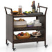 Elevate your outdoor entertaining with this stylish 3-tier patio rattan bar cart. Crafted from high-quality, sun-proof and anti-fading rattan, this cart ensures durability and beauty. The broad countertop and 2 lower shelves are perfect for securely holding dinnerware, beverages and condiments. With easy-to-manage lockable wheels and dual side handles that double as towel racks, mobility and convenience are at the forefront of this design. Whether it's a sunny poolside gathering or a cozy backyard dinner, this well-made bar cart seamlessly blends functionality with elegance, making it a must-have for any outdoor setting. Enhance your hosting experience with this versatile outdoor essential. Long-Lasting Rattan Elegance: The well-woven rattan of the bar cart adds a touch of beauty to the surroundings, which is also anti-fading and sun-proof for long-term outdoor enjoyment. Note: Please avoid rain exposure for prolonged service life. Tier Storage Space: This patio serving cart boasts aspaciouscountertop and 2 storage shelves below, perfect for arranging dinnerware, wines, meals, seasonings and so on, making it your ultimate outdoor hosting companion. Simple Movement: Equipped with 4 universal wheels which are easy to lock and unlock, the outdoor dining cart can be easily located anywhere you want. And the push handles on the 2 sides help you effortlessly control the direction. Considerate Design: The anti-falling baffles on the 2 lower shelves effectively ensure safe placement of the items on the patio cart. Each side handle is also perfect as a towel rack to enhance functionality. Versatile Application: As a practical and attractive choice, this serving table on wheels seamlessly integrates into various outdoor settings such as backyards, poolside areas, and porches.