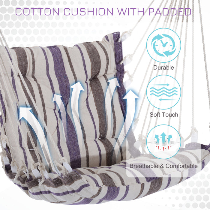 Choose comfort without compromising on style. Gentle colors of brown and off-white mixed with hints of purple stripe create a palette that soothes the soul and enhances the aesthetic of your chosen space. The net weight of 2.4kg makes it a breeze to maneuver, while its generous dimensions offer ample space to lounge and melt your stress away. Make this hammock chair the next great addition to your leisure lifestyle and relish in the relaxation it brings.