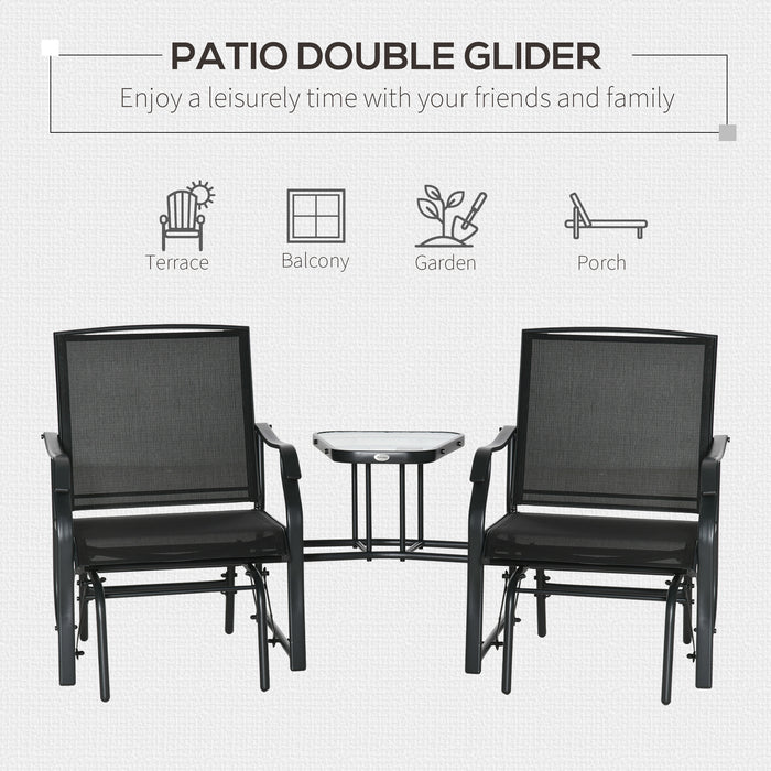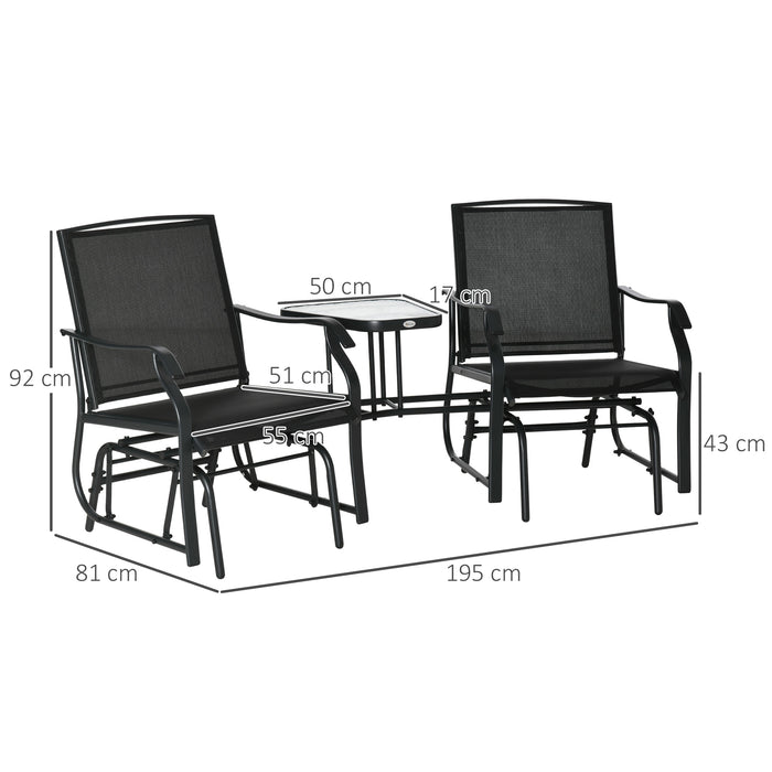 Get the best of relaxation with our unique dual-seat setup, featuring individual gliding chairs that let you sway gently and relax to the rhythm of nature. The added convenience of a central table with a sleek glass top provides the perfect surface for your refreshments, reading materials, or a delightful outdoor brunch.