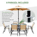 Introducing our sophisticated Al Fresco Dining Ensemble, designed to transform your outdoor space into a tranquil dining retreat. Effortlessly host memorable gatherings with this complete set, which includes a sleek table, six foldable chairs, and a protective round umbrella.