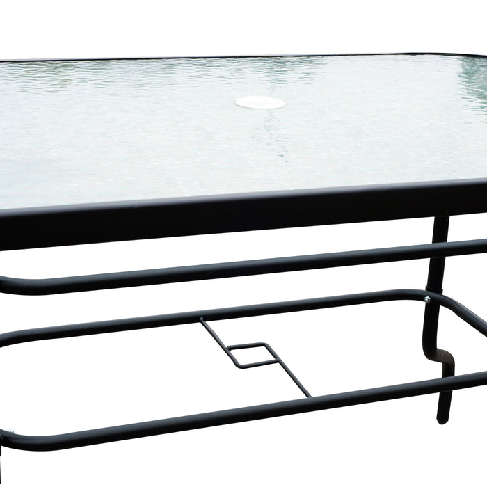 At the heart of this dining set lies the elegant rectangular table featuring a 5 mm tempered glass top that combines durability with a touch of class. The table is thoughtfully designed to accommodate the round umbrella, promising generous shade coverage on sunny days, and a comfortable ambiance for every outdoor occasion.
