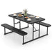 Our rectangular picnic table with 2 benches measures 149 x 135 x 75 cm (L x W x H), offering ample seating space for 2-4 individuals. With a convenient umbrella hole in the center of the tabletop, you can add shade with ease (Note: Require a weighted base to secure your umbrella, not included). The tabletop and bench seats are crafted of reliable HDPE, which resist scratches and weather conditions, built to last. Moreover, the plastic surfaces are also waterproof for easy cleaning, ensuring it looks great all year round. The robust metal frames, complemented with adjustable footpads and sturdy screw connections, ensure stability and durability, making it suitable for various outdoor settings without wobbling. Whether for poolside BBQs, patio dining, school recreation areas, outdoor restaurants, or cozy indoor craft spaces, our table bench set can be a perfect choice! Bullet Points: Ample Seating Area: This patio furniture includes a rectangular picnic table measuring 135 x 70 x 75 cm (L x W x H) and 2 benches measuring 135 x 24 x 45 cm (L x W x H), which could comfortably seat 2-4 people, making it perfect for family gatherings or intimate picnics. Premium HDPE Material: Constructed from high-quality HDPE, this picnic table bench set is weather-resistant, fade-resistant, and scratch-resistant, ensuring long-lasting performance. Moreover, its waterproof surfaces make maintenance a breeze, while the delicate wood grain finishes add a touch of elegance. Convenient Umbrella Holder: This outdoor dining table is equipped with a 4 cm built-in umbrella hole, which allows you to effortlessly secure an umbrella for shaded dining, creating a comfortable outdoor retreat. NOTE: The umbrella is not included, requires a weighted base for fixation. Sturdy and Stable Construction: Supported by heavy-duty powder-coated metal frames, the table and benches provide reliable support and are not easy to deform or crack. Complemented with adjustable footpads, the dining set keeps stable even on the slightly uneven floors. Versatile Use: Whether you’re hosting a picnic, barbecue, party, or simply need extra seating for outdoor entertaining, our picnic and bench set is ideal for offering practical seating solutions to any environment. It can also be served as a dining table in your living room.