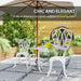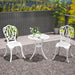 Add a touch of elegance to your outdoor areas with this Outsunny set. Includes two chairs and a matching table. Centre umbrella hole to hold a parasol in place. Garden table and chairs are made from aluminium for strength, with the decorative patterns for a decorative finish.