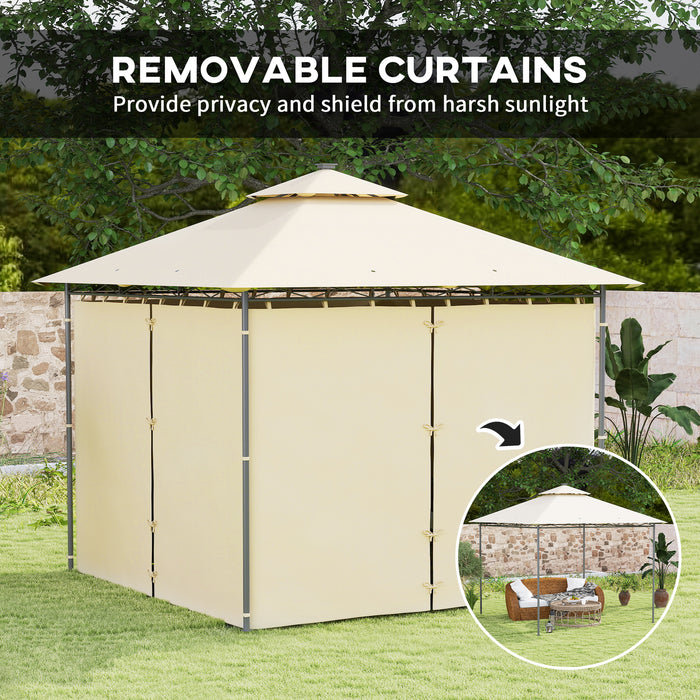Transform your garden into a luminous haven with the Outsunny garden shelter. Its solar-powered LED lights, including a central beacon and 44 bulbs, ensure magical evenings under a starlit sky. The dual-roof design enhances airflow, while the splash-resistant polyester canopy with drainage holes keeps the rain at bay. Plus, removable curtains provide seclusion and shade, crafting the desired outdoor retreat.