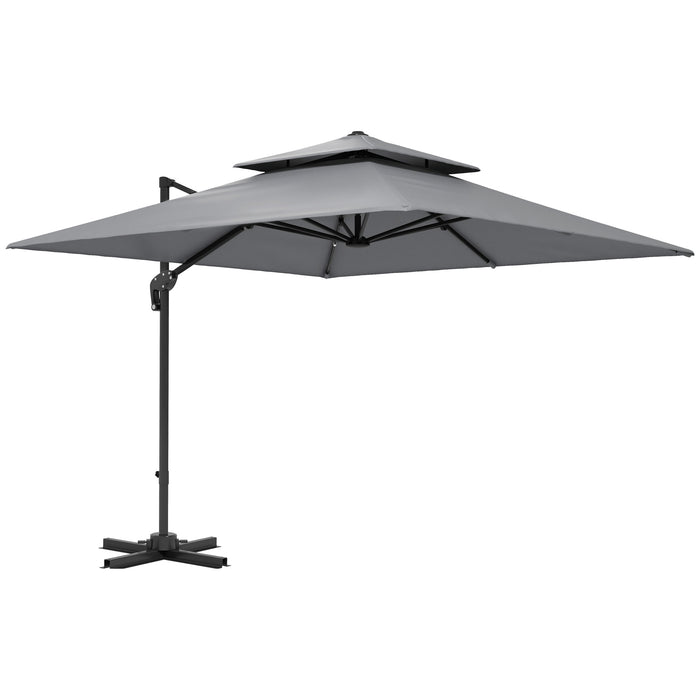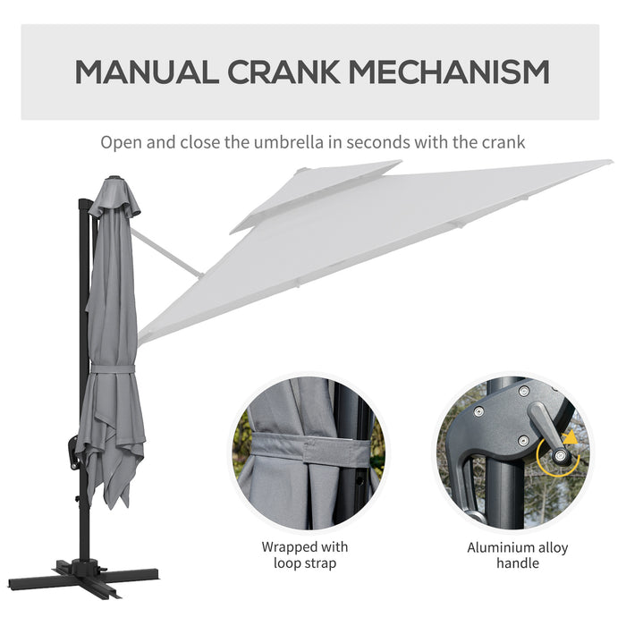 Keep yourself protected whilst enjoying the sun with this large cantilever parasol from Outsunny. Made from aluminium, the strong central pole is solid for years of use outdoors. Connected to the frame via eight metal ribs for extra strength, the water-resistant polyester canopy provides protection from direct sunlight and heat, with a 2-tier top to allow air to circulate. Using a crank mechanism for easy opening and closing, the canopy can rotate 360° to keep you covered all-day long.