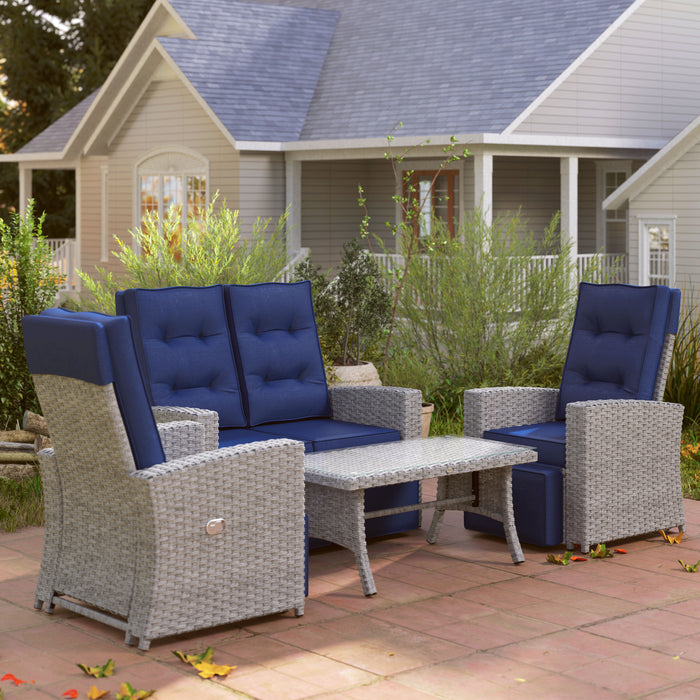 - Reclining armchairs, with footrests: Adjust the backs of both the chairs easily - from 90° upright to 135°. Manually operated, with footrests to elevate lower body too. Extra relaxing time as you sit in this outdoor furniture set.