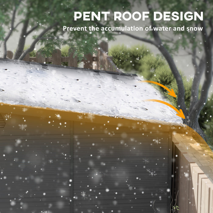 Discover the charm of effortless organisation with the Outsunny garden shed. Crafted from lightweight, waterproof PP resin with a robust aluminium frame, this plastic garden shed braves the elements without a fuss. Enjoy natural light from two transparent windows and keep the air fresh with dual vents. The pent roof design smartly prevents water and snow build-up, making it a splendid choice for any garden.