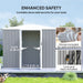 - Built to last: Made of painted galvanised steel, this outdoor shed is engineered to resist UV rays, rust and water. Reinforced with internal support frames, it's designed for stability and durability in any weather.