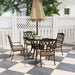 - Five-piece outdoor dining set: Includes a square table and four chairs with floral and grid cut-out patterns. Gather round with company outdoors, whenever you want.