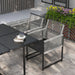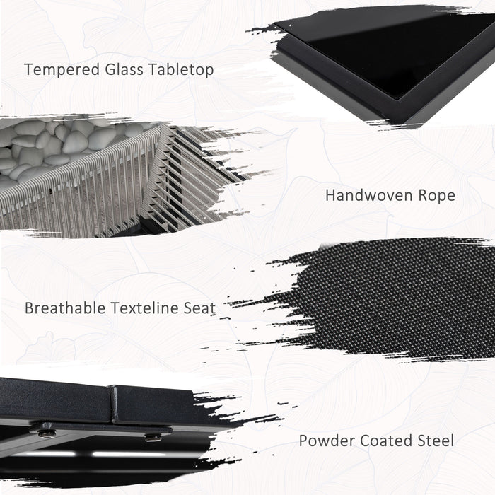 - Glass-top dining table: Tempered for strength to ensure a safe place to dine from. A sleek touch to this garden dining set.