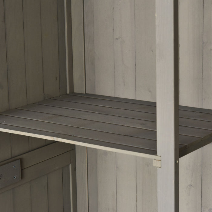 Our garden storage cabinet comes with a sleek grey weather-resistant finish, combating the elements and preserving the integrity of your stored items. No longer worry about the damp or mild outdoor conditions affecting your gardening gear. The asphalt roof is expertly angled to prevent water accumulation, ensuring everything inside stays dry and protected.