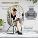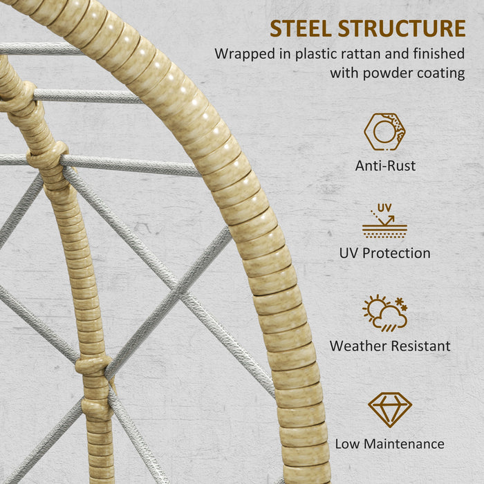 Relax in optimal comfort with this outdoor standing egg chair from Outsunny! This rattan garden chair with a rope woven hollow-out design is like a cosy bird-nest retreat. 20cm thickened cushion and a separate head pillow offer luxurious comfort. A steel frame means a strong, supportive core, whilst the outer plastic rattan wicker offers a stylish and protective top. Complete with a side cup holder for keeping drink within reach.