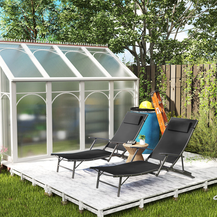 Soak up the sunshine in style with the Outsunny Folding Sun Loungers. Featuring a four-level adjustable backrest and a breathable, quick-dry texteline mesh, these garden loungers are great for any outdoor space. Designed as a garden lounge set, they are lightweight, foldable, and come with a cosy removable head pillow, making relaxation easy and blissful.