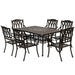 - Seven-piece set: includes a rectangular dining table and six armchairs