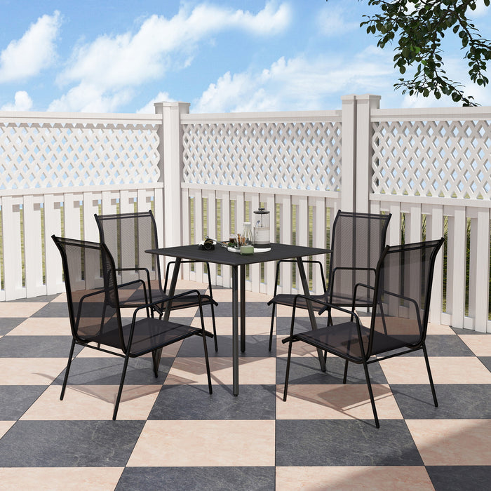 Transform your garden gatherings with the Outsunny garden table, designed to comfortably seat four. The slat-style tabletop prevents water build-up and simplifies cleaning, while the rust-proof powder-coated steel frame ensures longevity. Its chic, simple design complements any garden decor, making it a stylish addition to your patio or outdoor dining space.