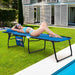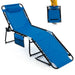 This patio chaise lounge offers adjustable backrest and footrest for customized use for sunbathing, reading and sleeping. Made with high quality fabric and a sturdy metal frame, this folding sun lounger ensures years of enjoyment. With a soft headrest that can be removed or adjusted, you are able to lie down comfortably. And the convenient side pocket renders objects easily accessible. What’s more, the reclining lounge chair is foldable and portable, making it easy to transport and store. You can put it in your patio, garden, poolside or take it for outdoor activities. Bullet Points:Adjustable Backrest and Footrest: The portable sun lounger features a 4-position adjustable backrest, which will allow you to find a desired angle for customized comfort. Likewise, the footrest can be put down as needed. Varying from other patio chaise lounge chairs, this one has an increased ground clearance up to 41 cm. So, it will provide you with upgraded comfort. Foldable and Portable Design: With a foldable design, this patio chaise lounge simplifies transport as well as storage. More importantly, the lightweight design makes it easy for you to take this folding sun lounger anywhere. Selected Quality Materials: The outdoor folding chaise lounge is made of breathable fabric attached by elastic bungee ropes, enabling you to feel cool. Supported by a stable U-shaped frame made of heavy-duty metal pipes, this reclining chaise lounge chair boasts excellent stability. And the anti-slip foot pads increase overall steadiness. User-friendly Features: Featuring adjustable and detachable design, the padded headrest gratifies your different needs. In addition, the folding chaise lounge chair is equipped with a removable side pocket to hold your phone, books and other items within easy reach. Wide Range of Use: This portable sun lounger is perfect for sunbathing, reading, sleeping, etc. Whether in the patio, garden or poolside, it fits well. Furthermore, you are able to take the folding chaise lounge for camping or other outdoor activities.