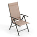 Transform any outdoor area into a comfortable dining spot with the adjustable patio high back chair. Featuring a versatile 7-level adjustable high backrest from 100° to 150°, this reclining lawn chair tailors to your comfort preferences. This stylish and no-assembly-required chair effortlessly combines convenience and durability with its ready-to-use design and robust, quick-drying fabric, suitable for the outdoor environment. Ideal for the garden, poolside, or camping trips, this patio chair’s lightweight and foldable attributes make storage and transportation a breeze. Adjustable High Backrest: This patio sling chair features a 7-level adjustable backrest, which provides personalized comfort for every user. Moreover, the 70cm high backrest ensures your entire back is cradled in comfort. Breathable and Fast-drying Fabric: Made with a high-quality and breathable fabric that dries quickly, this reclining high back chair is perfect for outdoor use. The fabric is designed to keep you cool and comfortable, even on extremely hot days. Easy Storage and Portability: The folding design makes this reclining lawn chair incredibly easy to store. Simply fold it up and tuck it away when not in use or take this patio chair with you on your next adventure. Ideal for Multiple Occasions: This patio folding dining chair offers a stylish and practical addition to your outdoor space, which is ideal for garden, lawn, poolside and camping trips. No Assembly Required: This adjustable patio sling chair comes fully assembled and ready to use. Simply unfold and enjoy instant comfort and convenience right out of the box. Unfolded Dimensions: 75-107 x 52 x 108-82 cm (L x W x H).