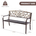 Our patio garden bench provides a comfortable area in your outdoor space for taking a break or talking with friends while enjoying the beautiful outdoor scenery. Made of premium cast iron and powder-coated steel, the outdoor bench is anti-rust and weather-resistant, ensuring long-lasting outdoor use. More than that, adopting the curved seat, high backrest, and smooth round armrests, the outdoor loveseat would provide enough support while relaxing your body and relieving fatigue. In addition, the bench is designed with exquisite decorative patterns on the backrest, adding a touch of elegance and retro to your garden or patio. And the gap between each slat would help drain on rainy days. If you are looking for such a product, do not hesitate to buy it! Sturdy & Rust-Resistant Material: The garden bench is constructed of a heavy-duty steel frame and iron cast backrest, which provide strong support and ensure long-lasting durability. Moreover, the waterproof coatings can effectively protect the garden bench from rust, peel, or chip in all weather. Ergonomic Design: The high backrest and curved seat perfectly fit your body curve offering a comfortable sitting experience. And the slatted-seat design provides better ventilation. Besides, there exist wide round armrests for relaxing arms in a comfortable position. Beautiful Patterns & Retro Appearance: The patio bench is designed with exquisite hollow butterfly patterns on the backrest and retro antique-brass colors, adding an elegant touch to your outdoor space. In addition, the surface is carefully polished without burrs for safety. Stable Structure & Easy Assembly: The metal frame provides thickened steel pipes and curved supporting legs, ensuring better strength and a large loading capacity of 300 kg. In addition, with detailed instructions and complete accessories, the garden bench is easy to set up. Wide Applications for Outdoor Use: The weatherproof garden metal bench is suitable for outdoor use, which provides a large seat for 2-3 persons sitting on it to talk or rest. Whether streets, courtyards, gardens, parks, balconies, terraces, entryways, or poolsides, it can be your perfect choice.